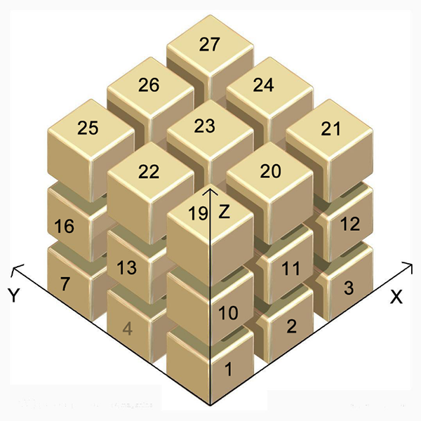 2、需要在XYZ方向上各堆3個產品,箱內總產品數為27個