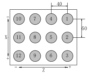 X 軸:間距 50/3個產品;Z軸:間距40/4個產品;Y 軸:間距30/2層。依照此設定,機械手沿X+軸方向間隔50mm 排列(①②③)三個產品在右邊第一列,再沿Z-軸方向移動40mm排列(④⑤⑥)三個產品在右邊第二列,以此類 推在排列完第12個產品后機械手沿Y-軸方向上升30mm,然后第一點位置開始重復排列第二層產品。由于是排列兩層產品,故共能排放24個產品于貨箱中。