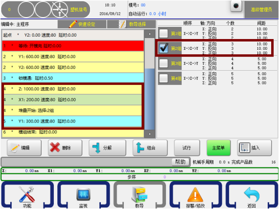 點擊將要使用的堆疊程序組(如第1組),在順序欄選擇產品要堆疊的順序, 設定好每個軸的堆疊產品個數和產品堆疊間距。