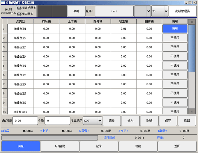 沖壓機械手控制系統為華成系列擺臂旋轉式沖壓系列機械手控制系統,系統在運行中堆疊的教導如下: