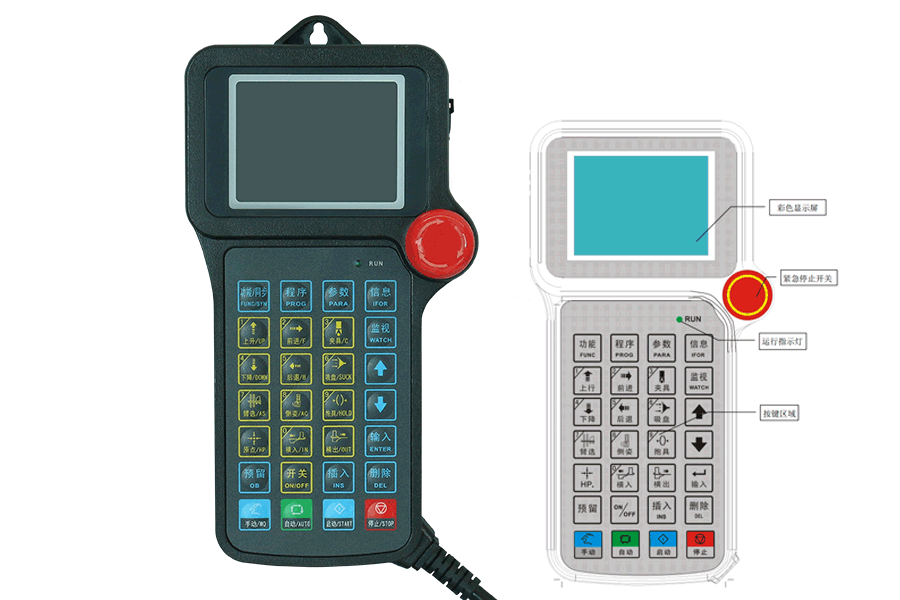 單軸注塑機(jī)械手系統(tǒng)應(yīng)用為華成工控系列注塑機(jī)械手控制系統(tǒng)HC-S1,手控器操作面板如下圖: