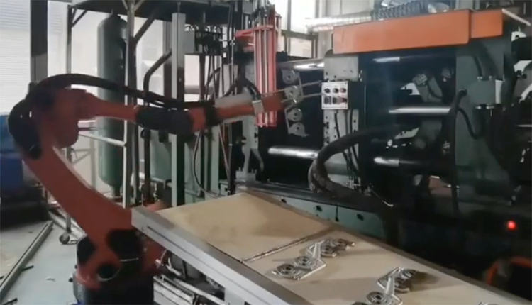 全自動壓鑄循環流程,包括清理模具-噴刷涂料-合模-澆注-壓射-凝固-開模-推出-取出鑄件。簡單就是噴霧-舀湯-取件三大流程。針對工藝的重復繁瑣,工人在高強度下勞作下,注意力分散,容易出現的作業事故。同時,從事鑄造人員的流失,行業向自動化方向發展成了必然。壓鑄“三位一體”機器人從噴霧-舀湯-取件三步走實現自動化生產,產品壓鑄成型,等待機械手取件,并清理模具,噴刷涂料模具,重新進入下一步舀湯澆注壓鑄產品的循環運作。高精度,柔性化的生產,自動化機器人的應用降低了勞動強度,提高了生產效率。