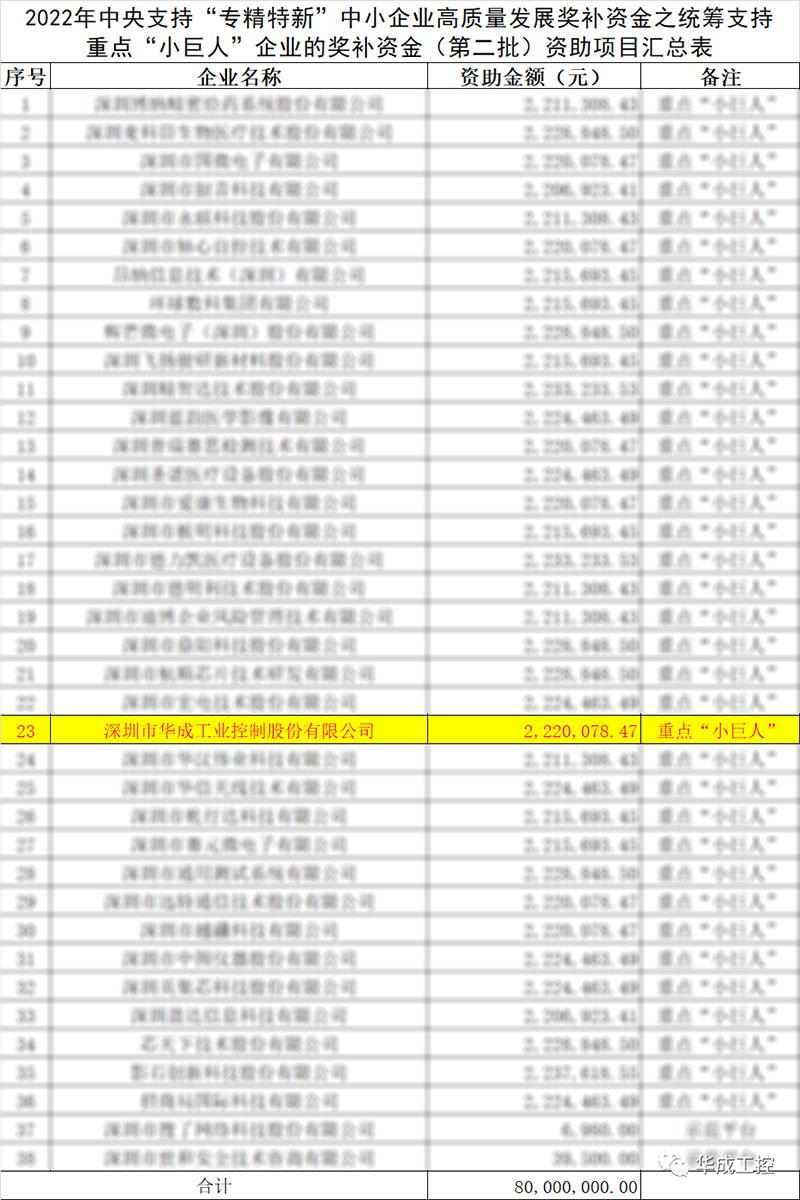 近日,2022年中央支持“專精特新”中小企業高質量發展獎補資金之統籌支持重點“小巨人”企業的獎補資金(第二批)資助項目已公示,深圳市華成工業控制股份有限公司榮獲國家級重點“小巨人”資助金222萬元!